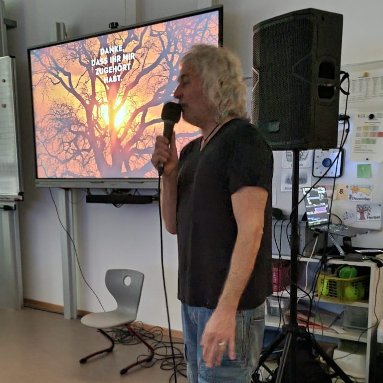 Die komplette Vertonung – von der Musik bis zur gesprochenen Begleitung – stammt von ihm selbst. Seine ruhige, angenehme Stimme schuf eine ganz besondere Atmosphäre und machte den Vortrag zu einem einmaligen Erlebnis. Die Kinder waren sichtlich beeindruckt und hörten gebannt zu.